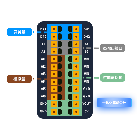 | 特性 | ADC分辨率:12bit,精度0.5%(5‰) 4路电流 (4-20mA),2路电压(0-5V) | |